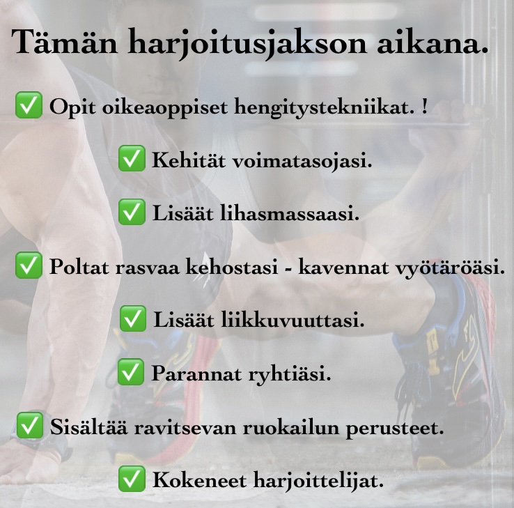 ✅ Harjoituspaketti kehittää ja vahvistaa kauttaaltaan meidän kehomme lihaksistoa. Ohjelman avulla parannat voimatasojasi, lisäät lihasmassaasi sekä kiinteytät vartaloasi. Monipuolista, kehittävää ja inspiroivaa valmennusta ammattivalmentajan avustuksella.