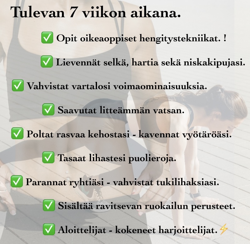 ✅ Harjoitteet voi hyvin tehdä vaikka kotona kaikki liikkeet tehdään omalla kehonpainolla. Ohjelmassa harjoitellaan yhteensä 3-5 kertaa viikossa, sisältäen aerobiset osuudet. Lopulliset harjoituskerrat viikkotasolla riippuvat omasta aktiivisuudesta. Ohjelmassa on huomioitu keveät viikot sekä harjoittelun nousujohteisuutta on huomioitu myös liikeprogression kautta. Harjoittelu etenee liikemallin sisällä haastavampaan suuntaan. Katso ja muuta sinun harjoittelu tottumustasi tämän ohjelman avulla. Tämä harjoituskausi kehittää sinua todella hyvin.