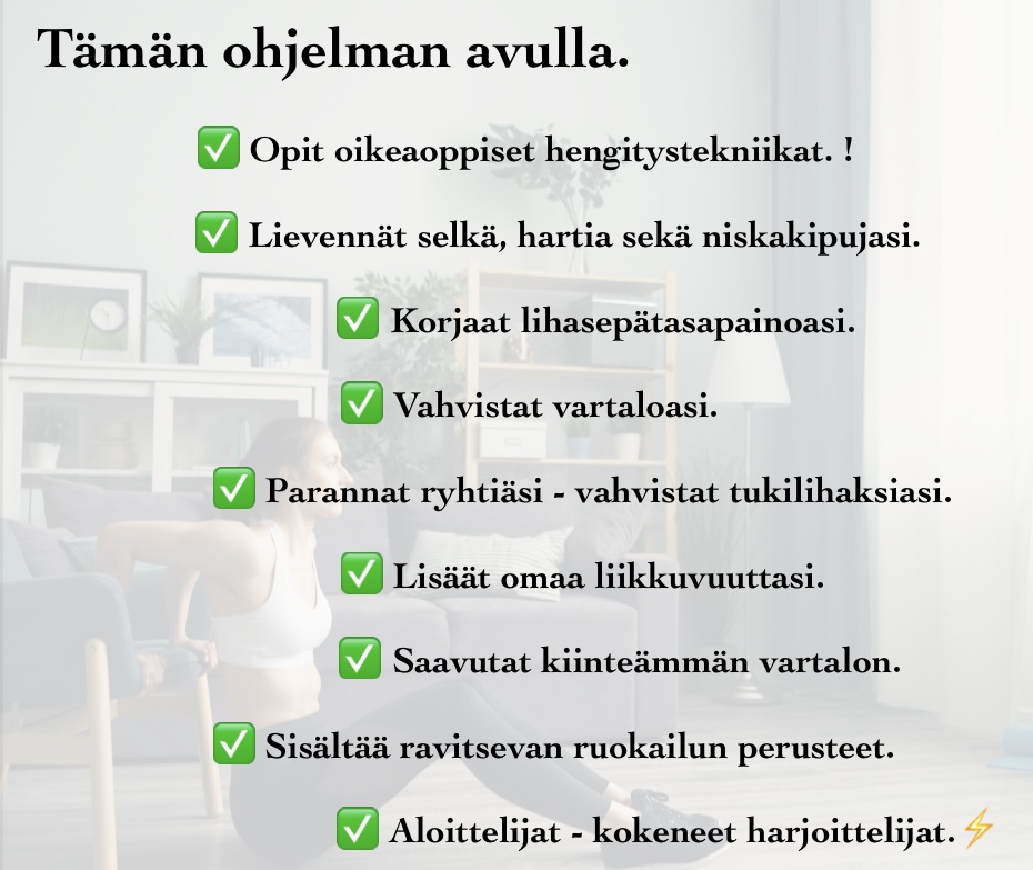 ✅ Harjoitteet toteutetaan omalla kehonpainolla kiertoharjoittelu tyyppisesti. Ohjelma parantaa lihaskestävyyttä ja vartalon ryhtiä. Näiden liikkeiden avulla saat myös vähennettyä selkä, hartia ja niskakipuja. Ohjelman avulla saat myös polttettua kehosta tehokkaasti rasvaa, kysymys kuuluu ! Oletko valmis laihduttamaan.?