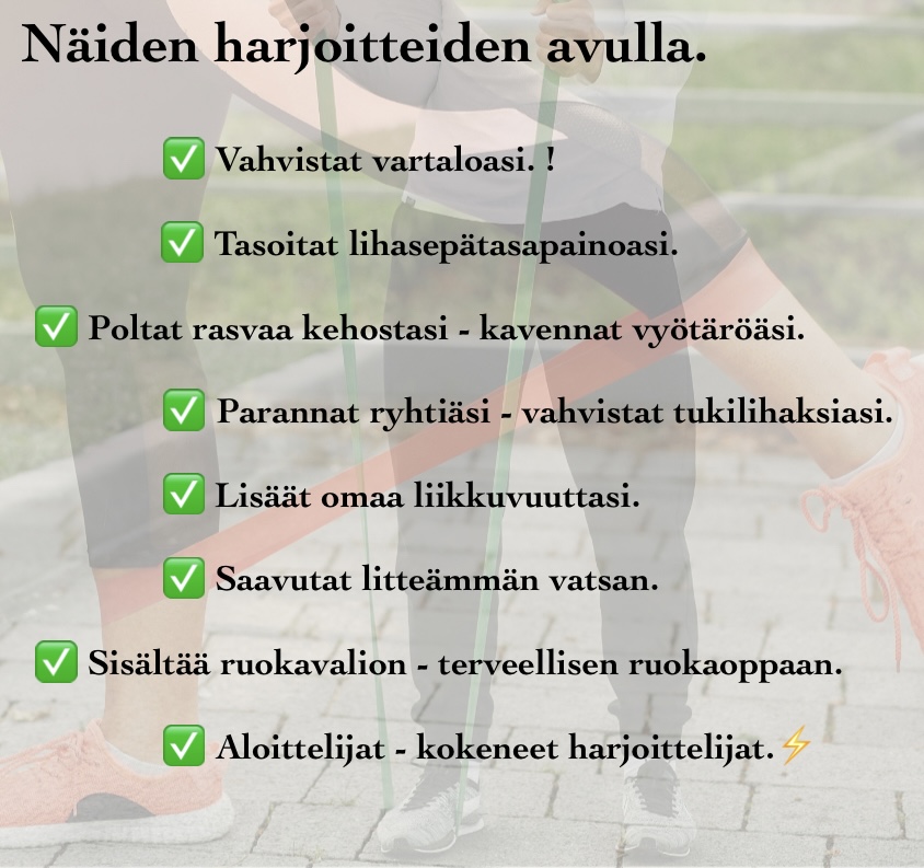 ✅ Harjoitusohjelma vahvistaa koko kehon lihaksistoa, tämän ohjelman avulla. Poltat vartalostasi rasvaa sekä tasoitat lihastesi puolieroja ja lisäät myös omaa liikkuvuuttasi. Tahdot edelleen saada tuloksia, hyppää mukaan valmennukseeni. Harjoitteet tehdään vastuskuminauhoja käyttäen, kehittävää ja tehokasta harjoittelua.