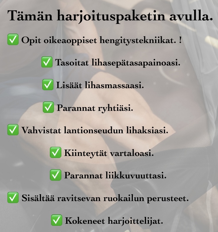 ✅ Ohjelman avulla tasoitetaan vartalon, jalkojen ja käsien lihasepätasapainoa. Tämän avulla lisätään voimaa ja saada lisää lihasmassaa, tällä tavalla koko keho toimii paremmin. Ohjelman liikkeet toteutetaan kuntosalilaitteilla sekä vapailla painoilla. Liikkeisiin on eri liikevaihtoehtoja, valitse itselle sopivin näin harjoittelu on tehokasta ja kivaa. Ohjelmalla voi harjoitella yhteensä 2–4 kertaa viikossa, ohjelmassa on erikseen myös aerobiset osuudet. Lopulliset harjoituskerrat viikkotasolla riippuvat omasta ajankäytöstä, sekä omasta harjoittelu motivaatiosta. Ohjelmassa on huomioitu keveät viikot sekä harjoittelun nousujohteisuutta.